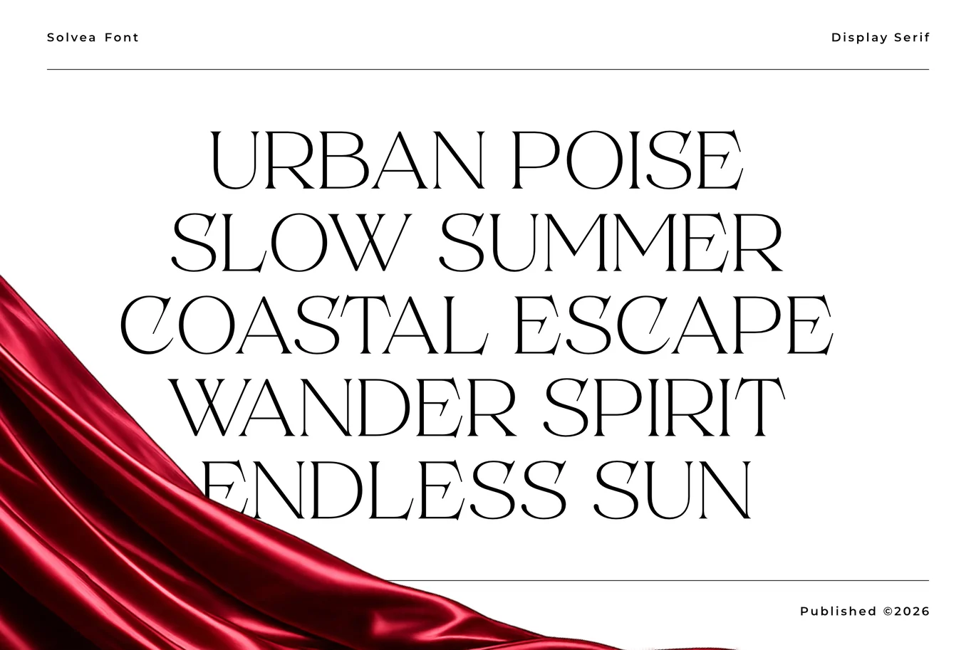 Crafted with a refined high-contrast design, Solvea brings a distinctive presence while maintaining clarity and readability. Each letterform is carefully shaped to deliver both aesthetic appeal and functional versatility, making it suitable for headlines, logotypes, and sophisticated visual systems.