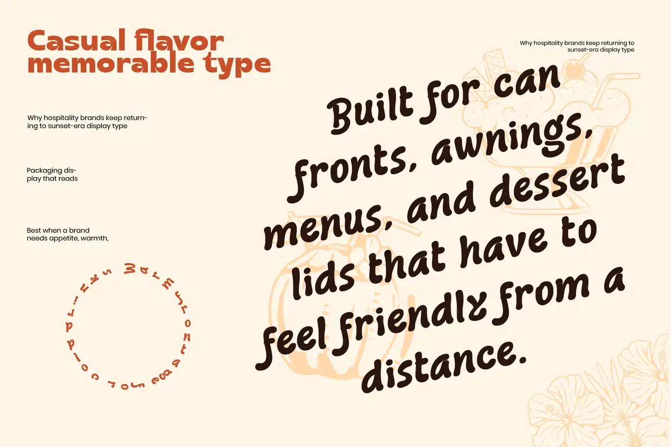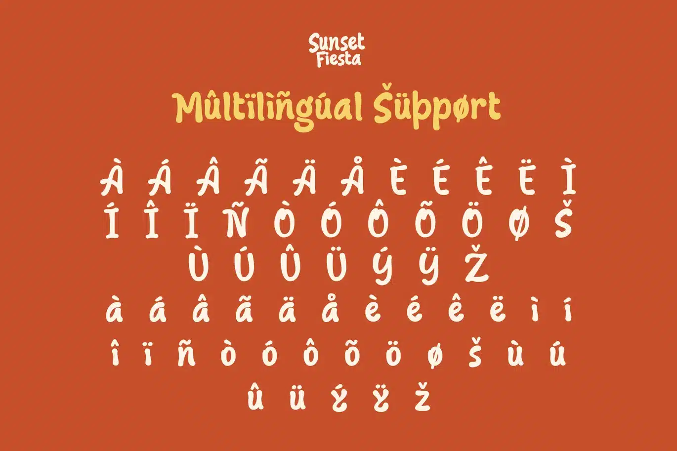 Sunset Fiesta is a bold, hand-crafted display font inspired by golden-hour warmth, tropical getaways, and retro summer culture. Designed for high-impact display use, it brings instant personality to any project.