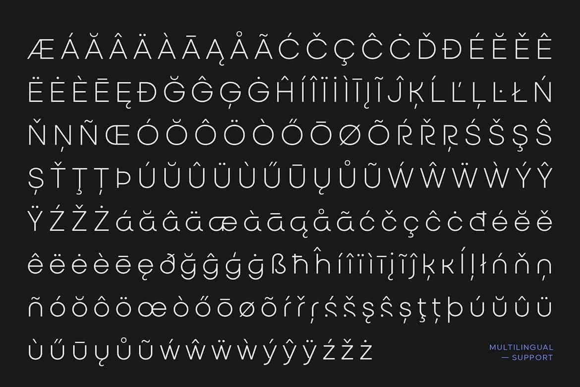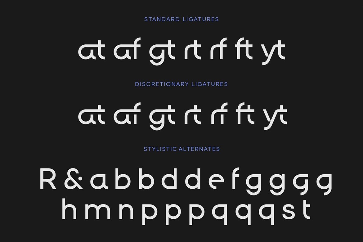 Uppercase and lowercase letters, numerals, punctuation, ligatures, discretionary ligatures, stylistic alternates, multilingual support, PUA encoding, easy installation, and compatibility with both PC and Mac.