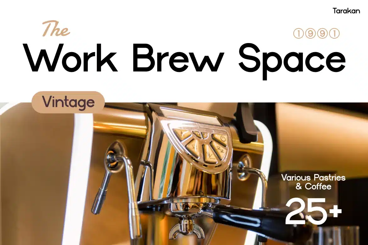 Tarakan is a modern geometric typeface crafted for clean workspace branding and lifestyle visuals, delivering effortless readability through balanced proportions, low contrast strokes, and crisp terminals. Its structured yet approachable letterforms create a calm, confident tone—ideal for contemporary coffee brands, productivity apps, and editorial layouts.
