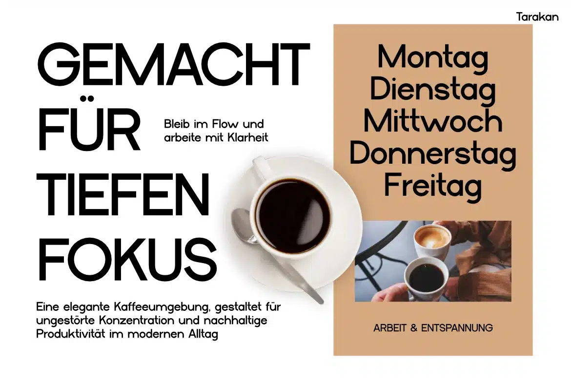 Tarakan speaks directly to designers building modern brands that value clarity and lifestyle aesthetics. Whether you're designing a coffee shop identity, a productivity app UI, or a clean editorial layout, this typeface helps communicate focus, calm, and efficiency. Its visual tone supports attention-grabbing headlines while maintaining readability in longer text—perfect for branding, posters, social media campaigns, and workspace-themed visuals.