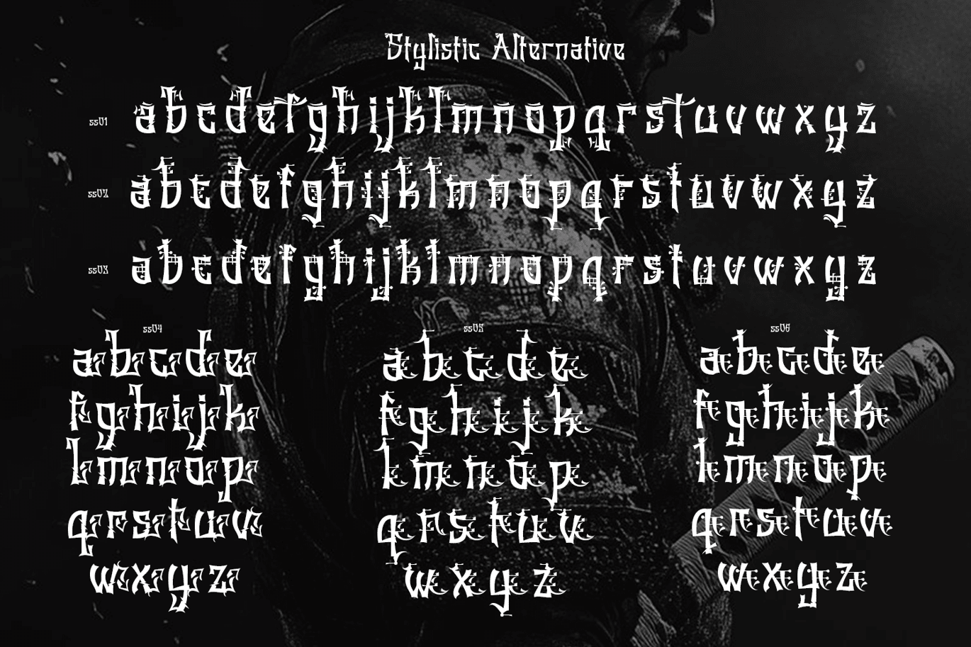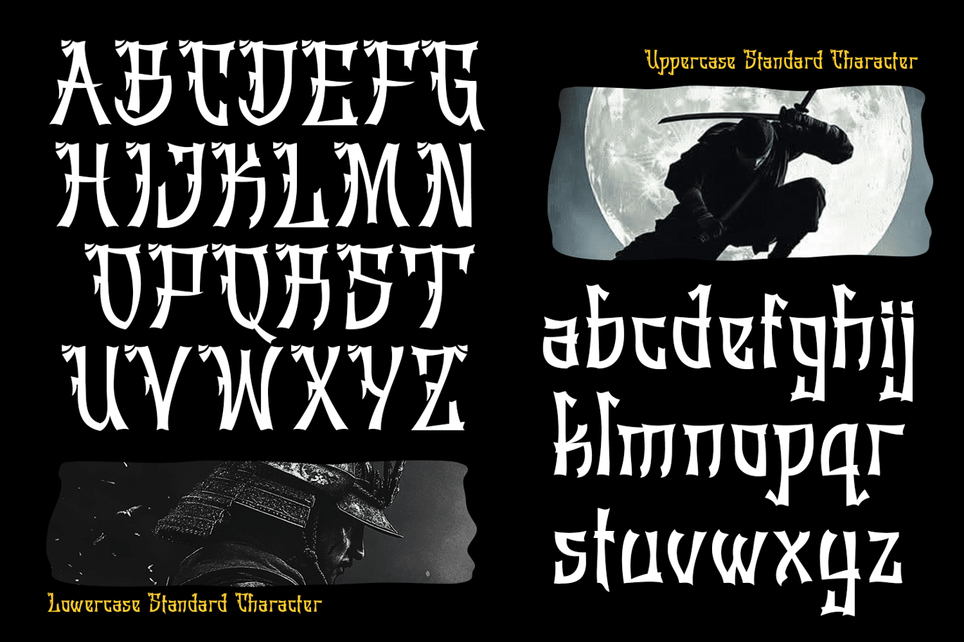 Introducing Tatsukaze display Japanese font, artistic characters, combining a classic feel with a touch of elegant Japanese aesthetics. The letterforms are sharp, decorative, and richly detailed, creating a dramatic and distinctive look. Each curve of the letterform feels like a vibrant calligraphic stroke, creating a unique and expressive visual feel. This font is suitable for logos, poster titles, creative designs, and visual works themed around fantasy and Japanese culture.