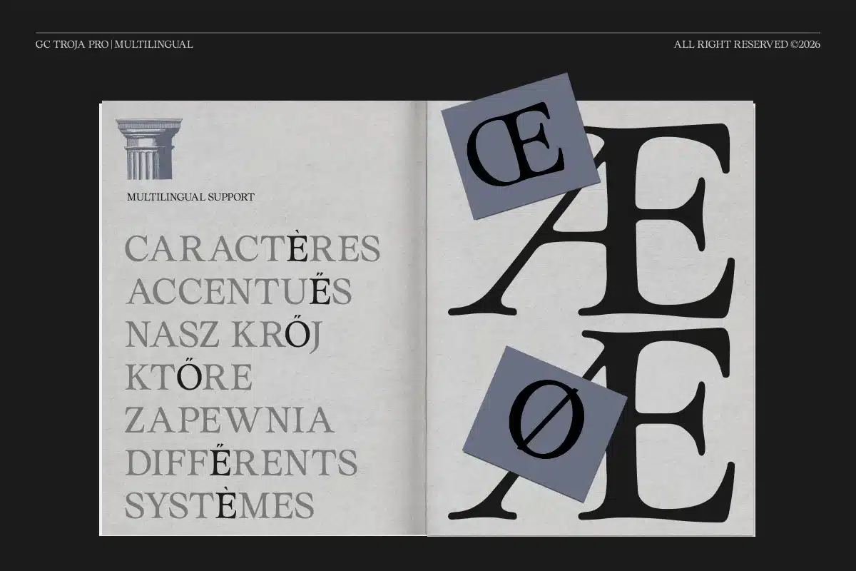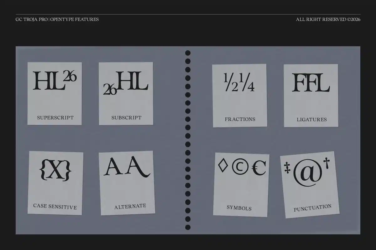 Whether used for sophisticated headlines, premium branding, or classic editorial compositions, GC Troja Pro brings heritage, elegance, and timeless serif character to your typography.