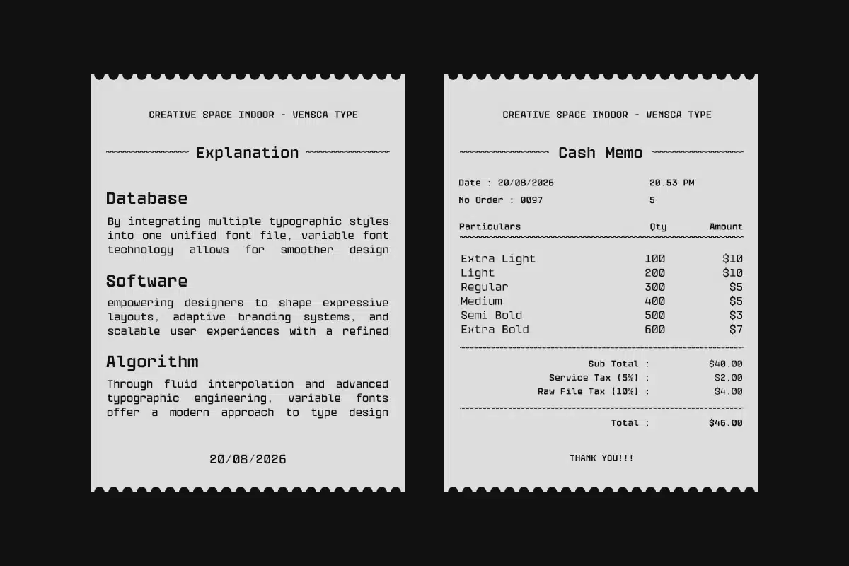 As a variable typeface,** GC Vensca Mono** offers flexible weight control, allowing designers to fine-tune hierarchy and adapt typography across multiple layouts and platforms with precision. Despite its technical foundation, the font maintains strong legibility and a clean visual rhythm, ensuring consistency without losing character.