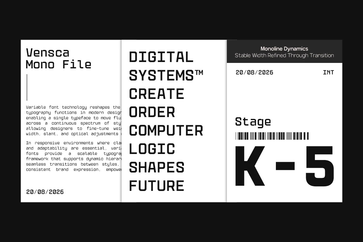 Whether used for structured interfaces, modern headlines, or grid-based compositions, GC Vensca Mono brings precision, clarity, and contemporary monospace aesthetics to your typography.