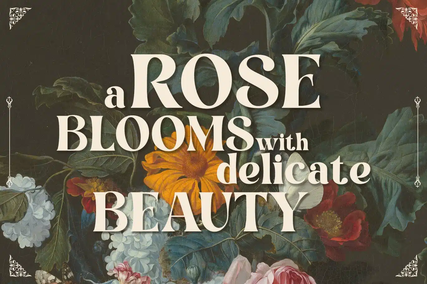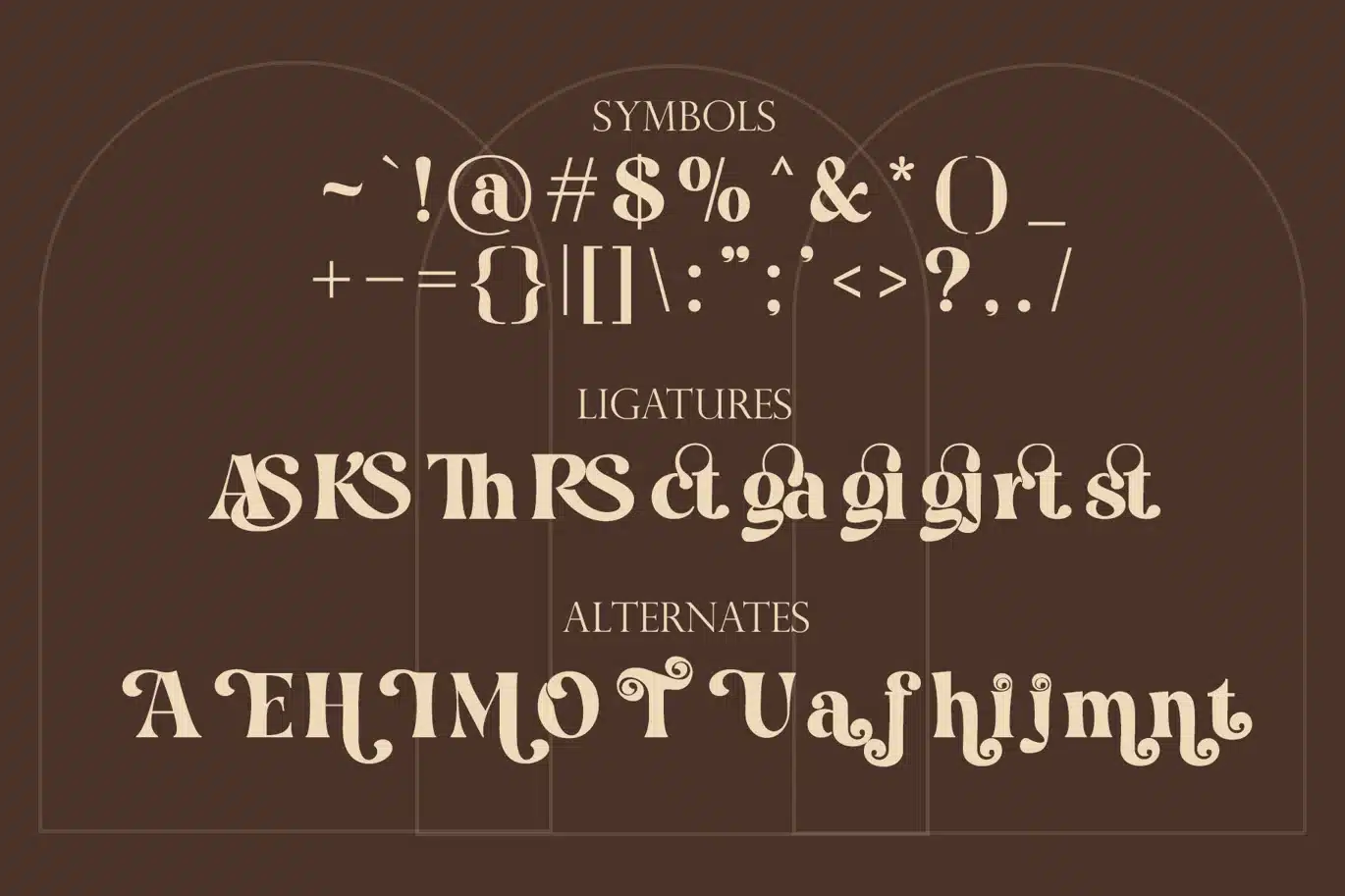 The typeface includes stylish alternates and ligatures that enhance its visual character while maintaining readability. Its contrast and structure make it suitable for both large display settings and controlled text compositions.